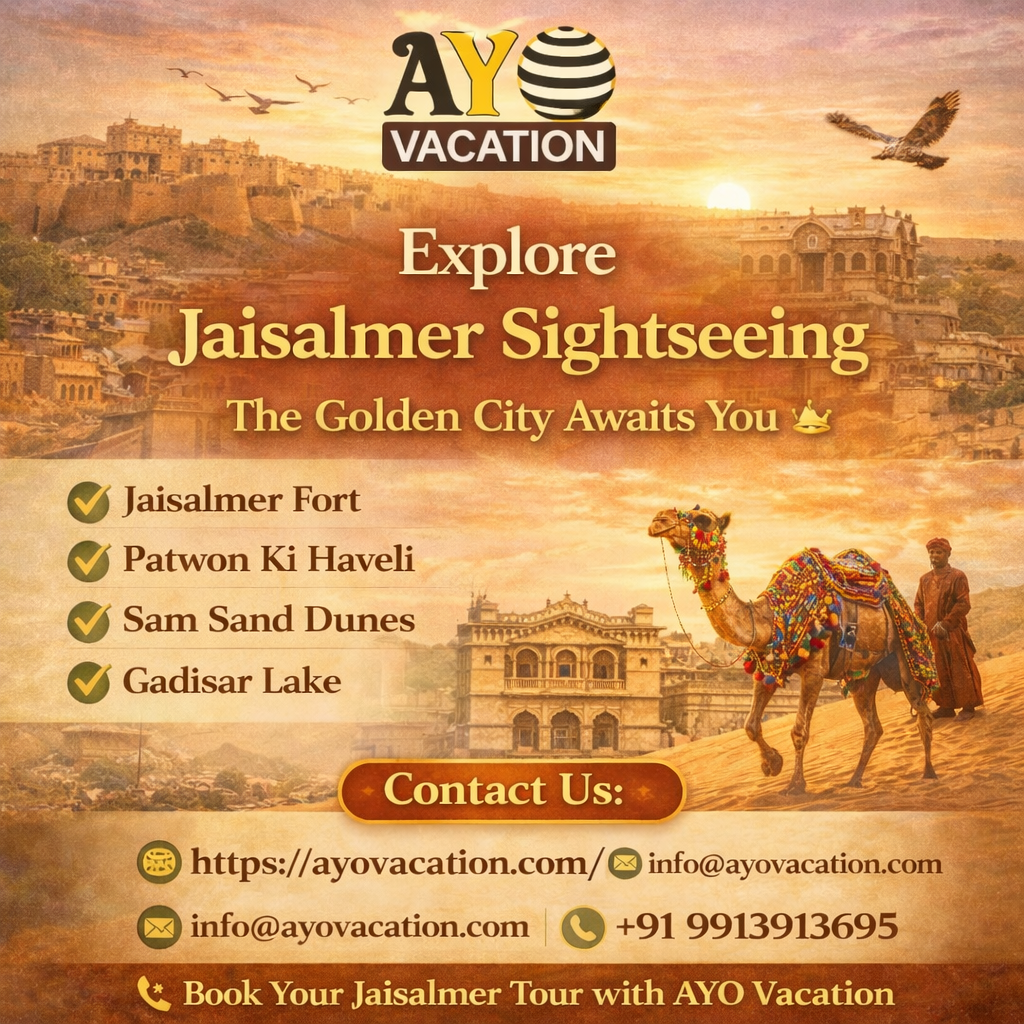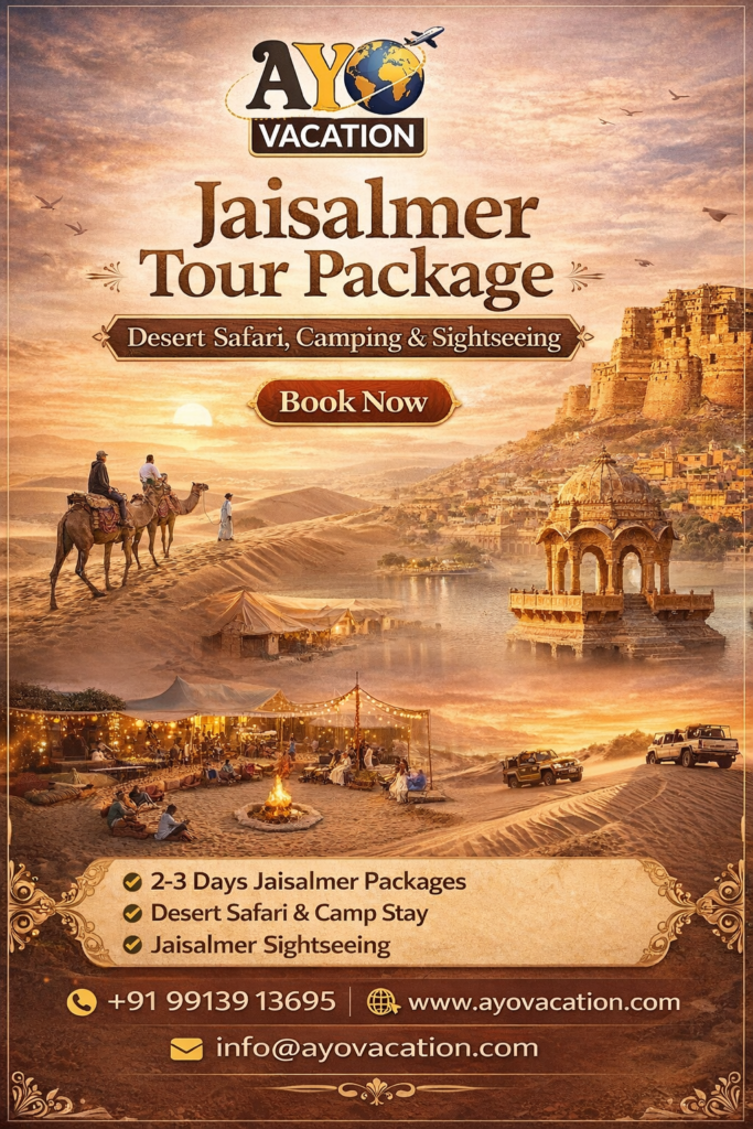 Welcome to Ayo Vacation, your trusted partner for unforgettable Jaisalmer tour package experiences. Known as the “Golden City” of Rajasthan, Jaisalmer is famous for its magnificent fort, golden sandstone architecture, and thrilling desert safari in Jaisalmer.