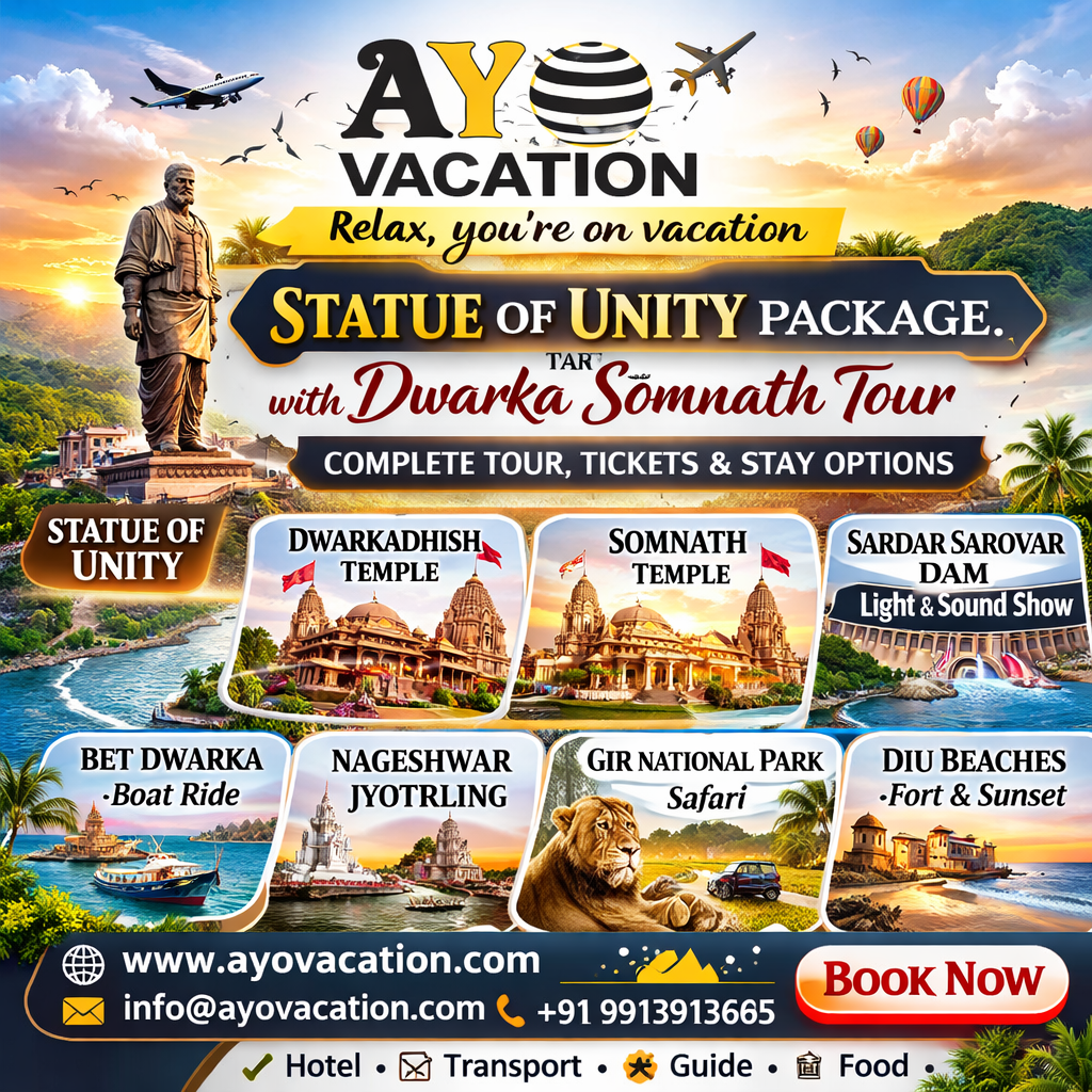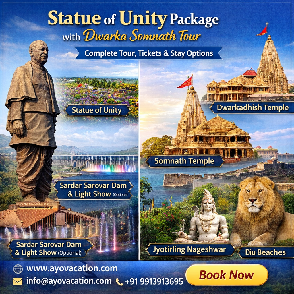 Experience Gujarat’s spiritual strength and modern pride in one unforgettable journey. From Somnath Jyotirlinga to Dwarka temple and the magnificent Statue of Unity, Ayo Vacation ensures a comfortable, well-managed, and devotional travel experience.