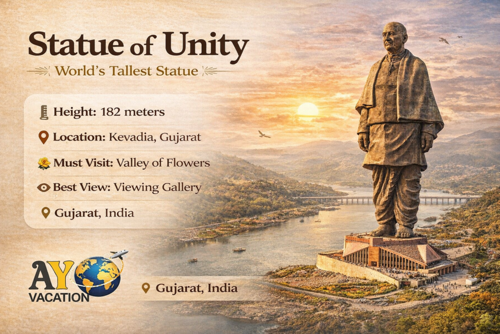 Experience the pride of India with a professionally organized Statue of Unity tour package by Ayo Vacation. From ticket booking to hotel stay and complete sightseeing, we take care of everything so you can enjoy a stress-free trip.